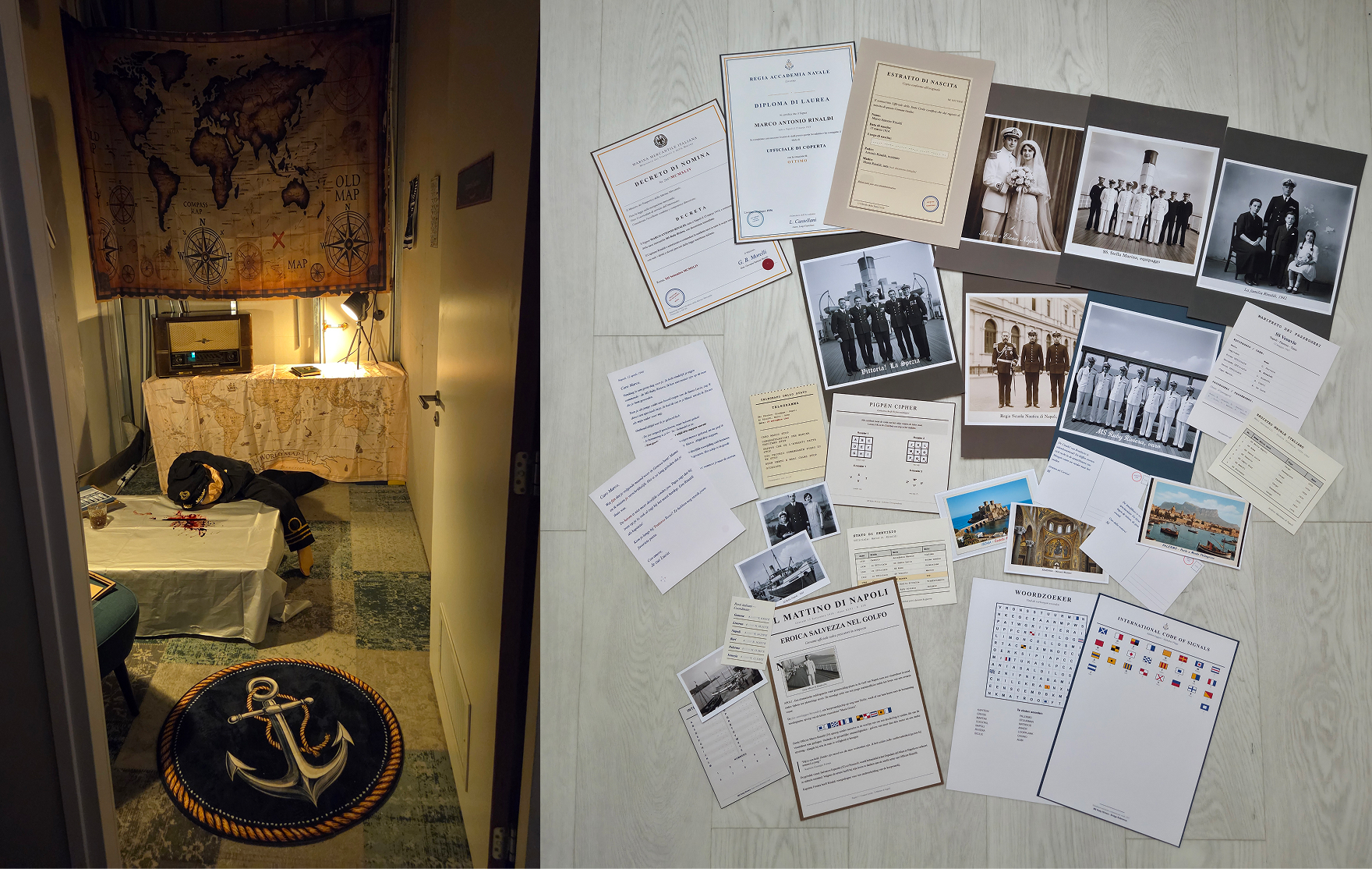 Een opbergruimte werd een afgesloten hut van de kapitein. Om binnen te komen moesten spelers zes QR-codes vinden, verspreid door het kantoor. Elke code opende een vraag in de app. De antwoorden lagen verstopt in fysieke props: AI-gegenereerde geboorteaktes, oude zeekaarten, vergeelde krantenknipsels. Pas als de groep alle zes de vragen correct had beantwoord, konden we de deur openen.