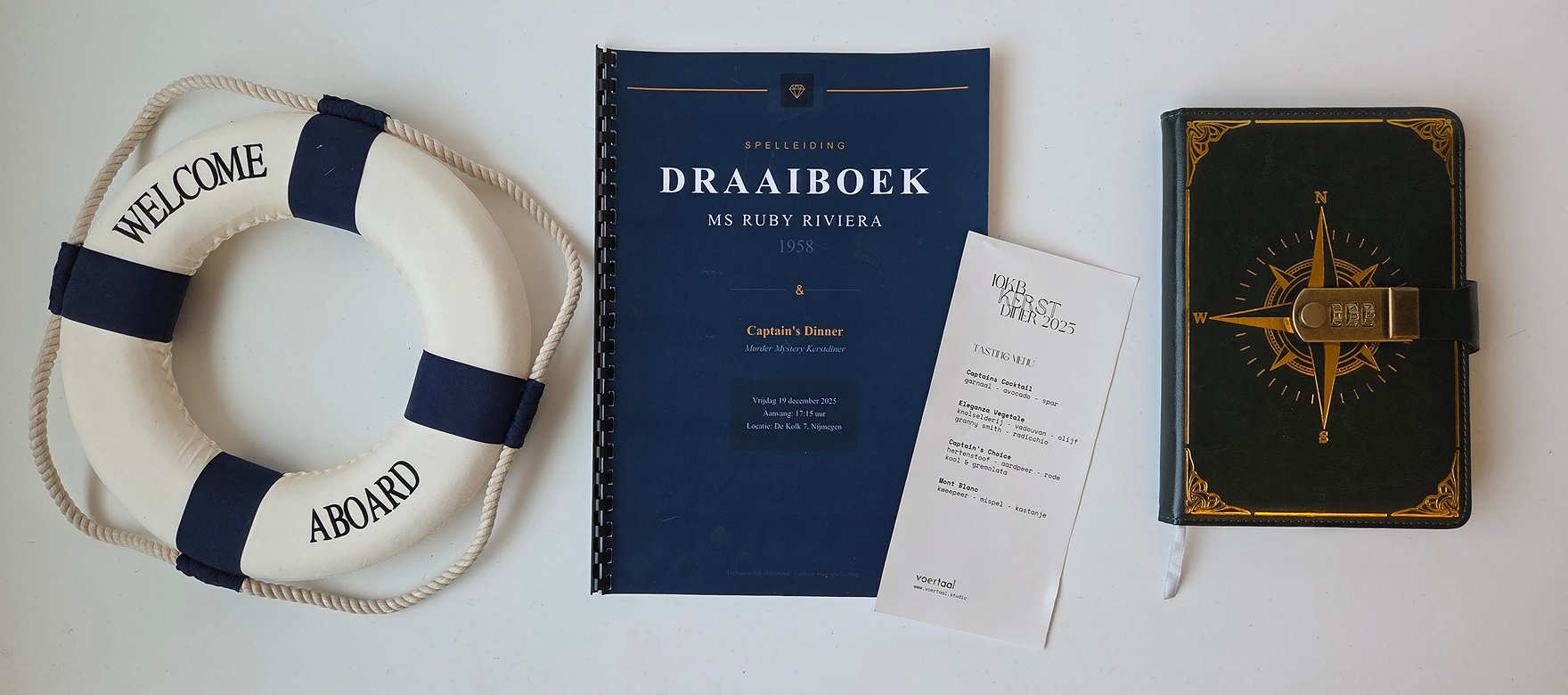 Op groot scherm draaide een patrijspoort met zicht op zee en een zichtbare klok, zodat iedereen, inclusief de keuken, precies wist hoeveel tijd er nog was tot de volgende ronde. Opus had het draaiboek gemaakt in een volledig in thema vormgegeven PDF: een minuut-voor-minuut script voor spelleiding en keuken, zodat de gangen perfect met het spelverloop syncten.