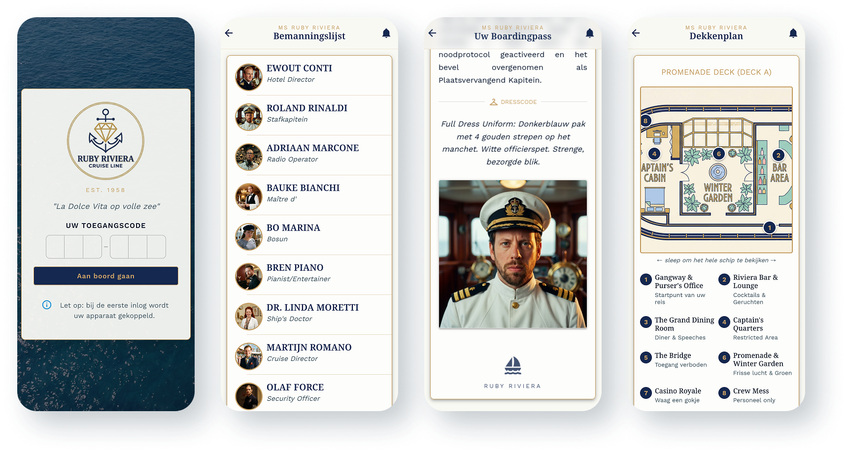 Daarna kwamen de persoonlijke teksten per ronde, push notifications, een visuele tijdlijn en scheepsplattegrond van ons kantoor. Tot uiteindelijk volledige puzzel-integraties met QR-codes en audiofragmenten. Feature creep, maar dan bewust. Want als je deadline een feestje is en je code daarna mag weggooien, zeg je niet "dat doen we in v2". Je bouwt het gewoon.